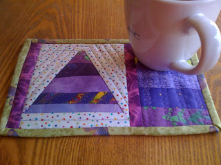 Jodi over at Pleasant Home is doing a great Scrap Along. The other day she posted a tutorial for a MUG RUG. Well after seeing a few of them I decided to make one this morning. Its a great way to use up scraps. I started saving the little bits of strings (anything under 1-1/2") leftover from cutting fabric, blocks, etc. I had them in this basket and new that one day they would find a home somewhere and I think I found it. I didn't worry about straightening the edges. I just picked out the purple ones and sewed them together. Crooked, straight didn't matter. Within a few minutes my Tree Mug Rug was born. It looks great under my coffee cup. Thanks Jodi for the Tutorial. I will definitely be making a few more.
